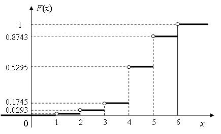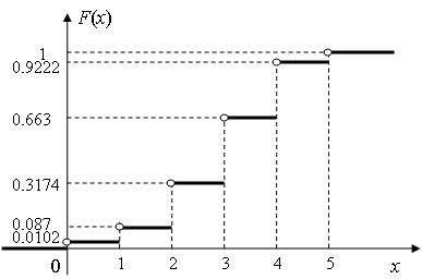 | Вероятность того, что цель будет поражена, т.е. будет хотя бы одно попадание соответствует вероятности события X ≥ 1. P (X ≥ 1) = 1 – P (X = 0) = 1 – 0, 0102 = 0, 9898. Функцию распределения F (х) находим по формуле (1.15) как функцию накопленных вероятностей , где суммирование распространяется на все значения индекса i, для которых xi < X. Полученные значения функции распределения записаны в последнем столбце таблицы 1.4. Искомая функция распределения имеет вид: . График функции распределения представлен на рис. 1.3.