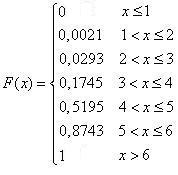 Функцию распределения F (х) находим по формуле (1.15) как функцию накопленных вероятностей , где суммирование распространяется на все значения индекса i, для которых xi < x. Полученные значения функции распределения записаны в последнем столбце таблицы 1.5. Искомая функция распределения имеет вид: . График функции распределения представлен на рис. 1.4. Ответ: M (X) = 4.4; D (X) = 0, 97; σ ≈ 0, 985; Р = 0, 8255.