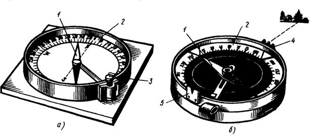 При ориентировании на местности для измерения магнитных азимутов и магнитных румбов пользуются буссолями (рис. 2.5, а) и компасами (рис. 2.5, б). Главные части буссоли или компаса - магнитная стрелка 1, вращающаяся на острие шпиля, и кольцо 2 с угловыми делениями. Северный конец стрелки делают темно-синим или вороненым. В зависимости от того, как подписаны деления, различают азимутальное и румбическое кольца. В азимутальном кольце деления подписывают против направления движения часовой стрелки от 0 до 360°, в румбическом - на концах нулевого диаметра ставят нули, перпендикулярного ему диаметра - 90°. В нерабочем состоянии стрелка приподнята на шпиле и прижата к защитному стеклу арретиром