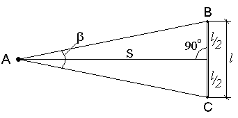 Этот способ основан на решение треугольника АВС, в котором для определения расстояния SC высокой точностью измеряют перпендикулярную измеряемой линии малую сторону l, называемую базисом, и противолежащий ей острый параллактический ей острый параллактический угол