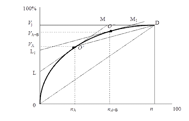 ¾ Остальные элементы ряда составляют группу С. Для графического способа классификации на группы АВС необходимо построить график кумулятивной зависимости Затем проводится хорда OD, которая соединяет прямой линией начальную и конечную точки (0-n). Касательная LM к выпуклой кривой накопленных издержек V (k), параллельная прямой OD, отсекает слева от точки касания группу категории А. Если далее соединить прямой точку касания с конечной точкой (хорда О’D) и провести параллельно ей новую касательную L1M1 к кумулятивной кривой, то новая точка касания разделит оставшиеся детали на группы В (слева) и С (справа).
