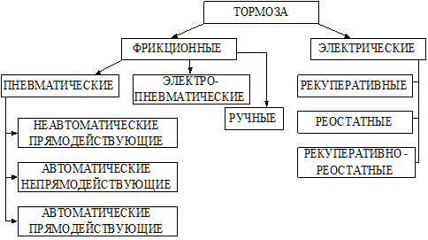 Схема электропневматического тормоза: 1 ¾ источник электрического тока; 2¾ контроллер ручки крана машиниста; К источнику электрического тока 1 и блоку управления 3, установленным на локомотиве, подключен контроллер крана машиниста 2. Линейными проводами он соединен с электровоздухораспределителями вагонов поезда. При тормозном положении ручки крана машиниста его контроллер соединяет цепь питания электромагнитного клапана торможения 5, который открывает доступ воздуха из запасного резервуара 6 в тормозной цилиндр 8. Электромагнитный клапан перекрыши при этом разобщает тормозной цилиндр с атмосферой. Происходит торможение поезда. При зарядке тормозов воздух из главного воздушного резервуара поступает через воздушную магистраль 9 и воздухораспределитель в запасные резервуары. При поездном положении ручки крана машиниста ток к электромагнитным клапанам не поступает. При разъединении тормозной магистрали и отсутствии электрического тока в цепи электромагнитных клапанов тормоз работает как пневматический, для чего имеется переключательный клапан 10. Электропневматические тормоза действуют одновременно по всей длине поезда, обеспечивают плавность торможения и сокращают время подготовки тормозов к действию. Электрическое торможение основано на возможности перевода тяговых электродвигателей в режим электрических генераторов, которые кинетическую энергию движущегося поезда превращают в электрическую. Создаваемый ими при этом вращающий момент стремится задержать вращение связанных с двигателями колесных пар, чем и достигается эффект торможения. Электрическое торможение применяется для подтормаживания и изменения скорости движения поездов на уклонах, а также для снижения скорости перед предстоящей остановкой. При электрическом торможении фрикционные тормоза не работают, устраняется возможность нагрева тормозных колодок и бандажейколесных пар и исключается их износ. t28 Различают три вида электрического торможения: · рекуперативное ¾ электрическая энергия, вырабатываемая тяговым двигателем локомотива, работающим в режиме генератора, возвращается обратно в электросеть. Применяется в электровозах постоянного тока. Меньшее распространение рекуперативное торможение получило на электровозах переменного тока; · реостатное торможение ¾ электрическая энергия поглощается реостатами и превращается в тепловую. Применяется на тепловозах и отдельных типах электровозов и моторвагонного подвижного состава; · рекуперативно-реостатное ¾ когда на высокой скорости движения используется рекуперативное торможение, а при более низкой ¾ реостатное. Такая система применена на электропоездах ЭР22, ЭР2Р, ЭР2Т и др. Ручные тормоза являются резервными средствами торможения в случае отказа автоматических тормозов в пути следования, а также используются для закрепления подвижного состава на путях станций. Такими тормозами оборудованы локомотивы, моторвагонный подвижной состав, пассажирские и частично грузовые вагоны. Привод ручного тормоза присоединен к рычажной тормозной передаче автоматического тормоза. На грузовых вагонах он размещен на переходных площадках, а на вагонах, не имеющих переходных площадок, стояночный тормоз расположен сбоку вагона.