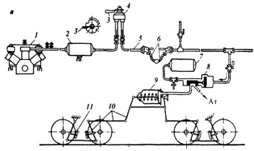Схема автоматического непрямодействующего тормоза в положении зарядки 1 ¾ компрессор локомотива, 2 ¾ главный резервуар; 3 ¾ ручка крана машиниста; 4 ¾ кран машиниста; 5 ¾ тормозная магистраль; 6 ¾ соединительные междувагонные рукава; 7 ¾ запасный резервуар; 8 ¾ воздухораспределитель; 10 ¾ рычаги и тяги тормоза; 11 ¾ тормозная колодка; Ат ¾ атмосферный канал