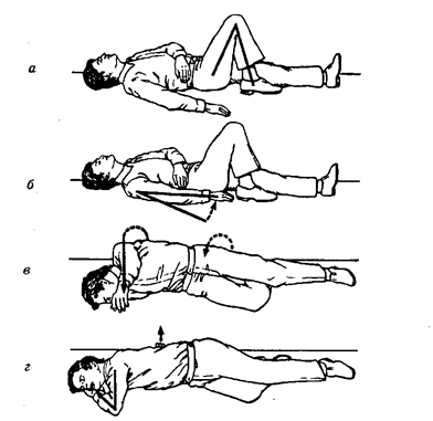 Розглянемо ще один прийом і, мабуть, досить на перший раз. Якщо у постраждалого зберігається самостійне дихання та працює серце, але свідомість втрачена і не виключена можливість западання язика з подальшою зупинкою дихання, то такому хворому треба придати певне положення тіла, щоб не виникли ускладнення. Це положення тіла на боку. За кордоном таке положення ще називають «ПОЛОЖЕННЯ КОМА». Як це робиться – див. малюнок: а) нога, на яку будемо завалювати тіло згинається у коліні; б) рука на цій же стороні підсовується під сідницю; в) завалюється тіло на бік так, щоб зігнута нога була знизу, верхня нога рівна; г) верхня рука підкладається під щоку, нижня – витягується з-під тіла позаду і згинається у лікті (так вона не дає тілу завалитися на спину).