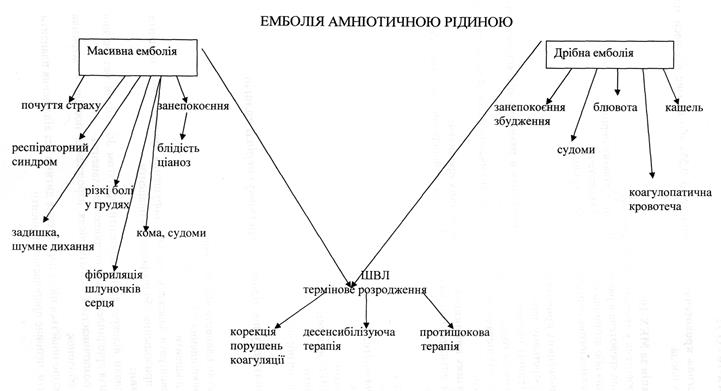 Емболія амніотичною рідиною - критичний стан, який виникає у разі проникнення елементів навколоплодових вод у кровоток матері та супроводжується розвитком гострої серцево-легеневої недостатності або зупинки кровообігу. Таке ускладнення можливе при підвищенні тиску в амніоні вище, ніж у кровоносних судинах матки або зіянні венозних судин матки. I. Причини, які підвищують внутрішньо матковий тиск: - надмірна пологова діяльність; - швидкі пологи; - застосування великих доз окситоцину; - багатоводдя; - великий плід; - багатоплідна вагітність; - тазове передлежання; - дистоція шийки матки; - переношена вагітність; - запізнілий розрив плодового міхура; - грубі маніпуляції під час родорозродження (прийом Крістеллера та ін.) II. Причини, які викликають зіяння маткових судин: - гіповолемія будь-якого походження; - передчасне відшарування плаценти; - передлежання плаценти; - ручне відділення та видалення посліду з порожнини матки; - кесарів розтин; - гіпотонія матки. Патогенез: навколоплідні води містять багато біологічно активних речовин (гістамін, серотонін, тромбопластин, простагландини та інш.), які при потраплянні до кровеносних судин викликають розвиток 2-х синдромів – гострої серцево-судинної недостатності (кардіо-пульмонального шоку) та коагулопатичної кровотечі (ДВС-синдрому). Клінічна картина залежить від об'єму та складу вод, що потрапили до кровоносних судин матері. Клінічні ознаки: - почуття страху; - занепокоєння, збудження; - озноб та гіпертермія; - кашель; - раптова блідість або ціаноз; - різкий біль у грудях; - задишка, шумне дихання; - зниження AT; - тахікардія; - коагулопатична кровотеча із пологових шляхів або інших травмованих місць; - кома; - судоми; - смерть внаслідок фібриляції шлуночків впродовж декількох хвилин. Взагалі клініка схожа на клініку ТЕЛА. Лікування: · при необхідності – реанімація; · оксигенотерапія (при нарстанні ознаків дихальної недостатності – інтубація трахеї та ШВЛ); · в/в інфузія – використовують кристалоїди та коллоїди у співвідношенні 1: 2 (реополіглюкін, рефортан, гелафузін, венофундин, глюкоза з вітамінами С та В). Швидкість інфузії повинна бути такою, щоб підтримувати АТ сист не нижче 90 мм рт.ст.; · для зняття бронхоспазму – еуфіллін 2%-10 мл в/в; · гормони – 300-400 мг преднізолона в/в або гідрокортизон 1000-1500мг; · при падінні АТ в/в крапельно дофамін; · свіжезаморожена плазма (лікування ДВС-синдрому); · інгібітори протеаз – контрикал 100тис-200-500 тис ОД в/в або гордокс 500тис – 1 млн ОД в/в; · на ранніх стадіях ДВС-синдрому гепарин по 5000-10 000 ОД 4-6 раз на добу).