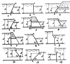 Задача 1. Для одной из схем сооружений определить аналитическим и графоаналитическим способами величину и точку приложения силы ГСД, действующей на затвор АВ. (Угол выбрать самостоятельно). Расчет производится по гидравлическим зависимостям, без использования основ теоретической механики и сопротивления материалов.
