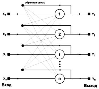 Среди различных конфигураций искуственных нейронных сетей (НС) встречаются такие, при классификации которых по принципу обучения, строго говоря, не подходят ни обучение с учителем, ни обучение без учителя. В таких сетях весовые коэффициенты синапсов рассчитываются только однажды, перед началом функционирования сети, на основе информации об обрабатываемых данных, и все обучение сети сводится именно к этому расчету. С одной стороны, предъявление априорной информации можно расценивать как помощь учителя, но с другой – сеть фактически просто запоминает образцы до того, как на ее вход поступают реальные данные, и не может изменять свое поведение, поэтому говорить о звене обратной связи с " миром" (учителем) не приходится. Из сетей с подобной логикой работы наиболее известны сеть Хопфилда и сеть Хэмминга, которые обычно используются для организации ассоциативной памяти. Далее речь пойдет именно о них. Структурная схема сети Хопфилда приведена на рис.4. Она состоит из единственного слоя нейронов, число которых является одновременно числом входов и выходов сети. Каждый нейрон связан синапсами со всеми остальными нейронами, а также имеет один входной синапс, через который осуществляется ввод сигнала. Выходные сигналы, как обычно, образуются на аксонах.