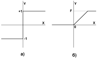 где f – активационная функция в виде скачка, приведенная на рис.5 а. Проверка, изменились ли выходные значения аксонов за последнюю итерацию. Если да – переход к пункту 2, иначе (если выходы стабилизировались) – конец. При этом выходной вектор представляет собой образец, наилучшим образом сочетающийся с входными данными. Как говорилось выше, иногда сеть не может провести распознавание и выдает на выходе несуществующий образ. Это связано с проблемой ограниченности возможностей сети. Для сети Хопфилда число запоминаемых образов m не должно превышать величины, примерно равной 0.15n. Кроме того, если два образа А и Б сильно похожи, они, возможно, будут вызывать у сети перекрестные ассоциации, то есть предъявление на входы сети вектора А приведет к появлению на ее выходах вектора Б, и наоборот.