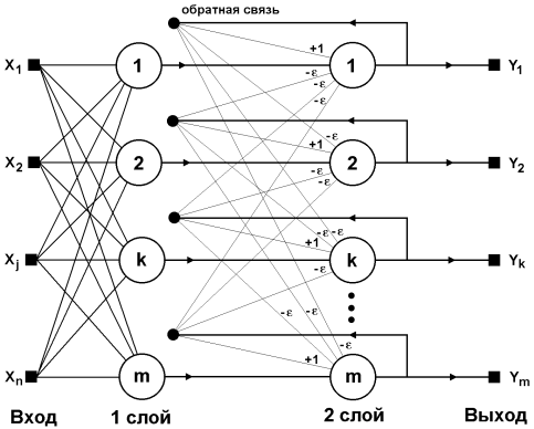 Когда нет необходимости, чтобы сеть в явном виде выдавала образец, то есть достаточно, скажем, получать номер образца, ассоциативную память успешно реализует сеть Хэмминга. Данная сеть характеризуется, по сравнению с сетью Хопфилда, меньшими затратами на память и объемом вычислений, что становится очевидным из ее структуры (рис. 6) Сеть состоит из двух слоев. Первый и второй слои имеют по m нейронов, где m – число образцов. Нейроны первого слоя имеют по n синапсов, соединенных со входами сети (образующими фиктивный нулевой слой). Нейроны второго слоя связаны между собой ингибиторными (отрицательными обратными) синаптическими связями. Единственный синапс с положительной обратной связью для каждого нейрона соединен с его же аксоном. Идея работы сети состоит в нахождении расстояния Хэмминга от тестируемого образа до всех образцов. Расстоянием Хэмминга называется число отличающихся битов в двух бинарных векторах. Сеть должна выбрать образец с минимальным расстоянием Хэмминга до неизвестного входного сигнала, в результате чего будет активизирован только один выход сети, соответствующий этому образцу. На стадии инициализации весовым коэффициентам первого слоя и порогу активационной функции присваиваются следующие значения: