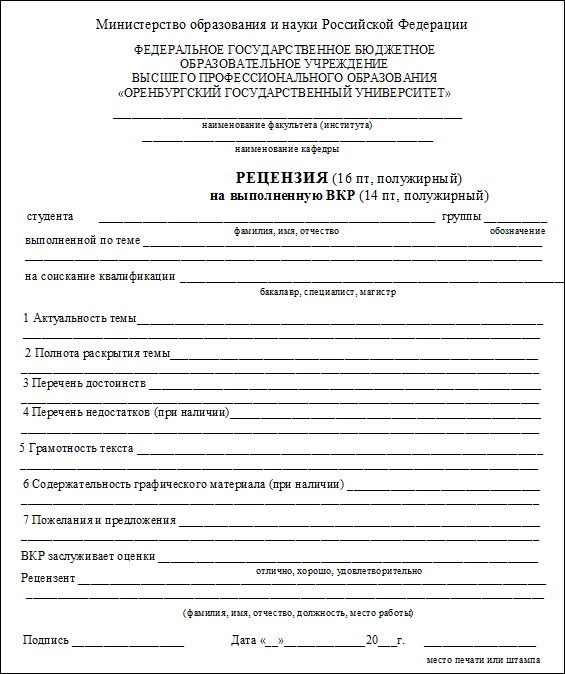 Примечания 1 Неуказанные размеры шрифта 12 пт. 2 При необходимости (большой объем) бланк «Рецензия на ВКР» может быть выполнен на обеих страницах одного листа.