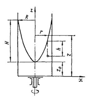 Поверхности уровня представляют собой параболоиды вращения. Уравнение свободной поверхности жидкости имеет вид: