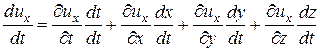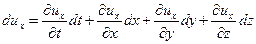 Производные от координаты движущейся точки по времени представляют собой соответствующие проекции ее скорости. Подставляя производные в уравнение и перенеся члены, содержащие скорость, в правую часть, получим систему общих дифференциальных уравнений движения жидкого тела (Эйлер, 1755г.):