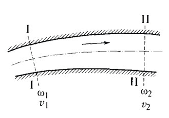 Рассмотрим поток с установившимся движением, ограниченный непроницаемыми стенками (рис. 3.4) Проведем перпендикулярно движению потока два поперечных сечения I -I и II - II, площади которых обозначим через