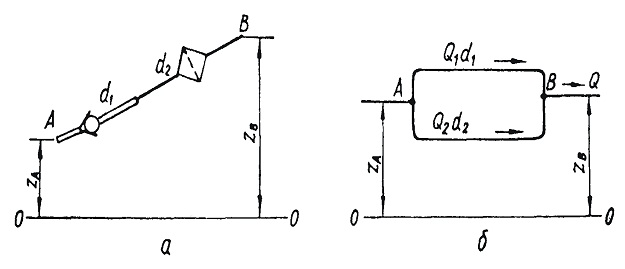 Под сложными трубопроводами понимают систему трубопроводов, имеющих ответвления, параллельные или кольцевые участки, переменный расход и т. д. При последовательном соединении трубопроводов различного диаметра (рис. 5.2, а) исходят из того, что полные потери напора в трубопроводе равны сумме потерь напора на отдельных его участках (