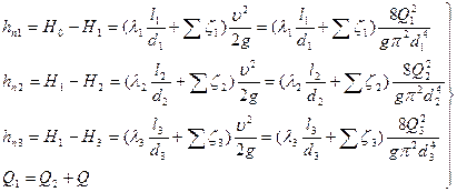 направление движения жидкости в трубопроводах может быть различным. Рассмотрим случай, когда Для решения задачи воспользуемся системой уравнений, связывающих искомые расходы