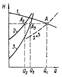 Зависимость суммарного расхода в трубопроводах 2 и 3 от напора Значение напора