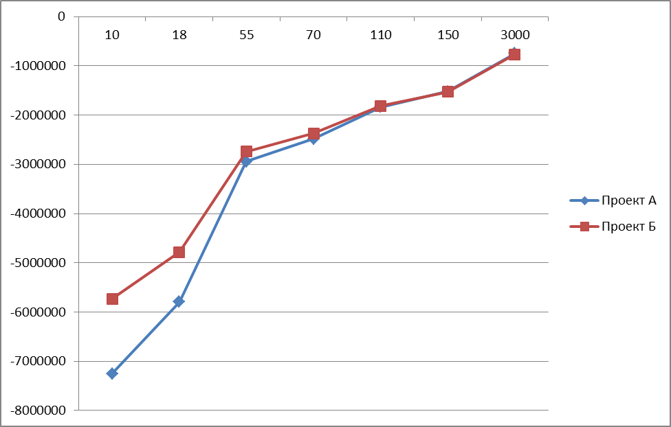 Как видно из графика и таблицы, значение чистой текущей стоимости не меняет свой знак, проект убыточный. По проектуБ нет точки IRR.