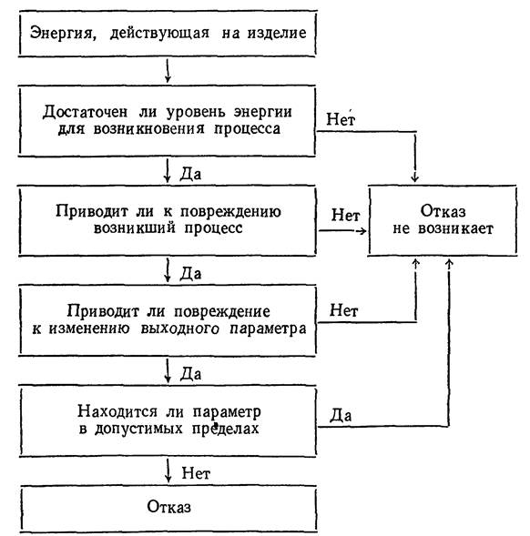 Рассмотрим блок-схему возникновения отказа (рисунок 3), опираясь на общее представление о протекании в машине различных вредных процессов (процессов старения), которые при определенных условиях могут привести к потере машиной работоспособности. При эксплуатации машины на нее действуют все виды энергии, но для возникновения вредных процессов необходим определенный их уровень. Если этот уровень не превзойден, то предпосылки для возникновения отказа будут устранены в самом зачатке. Если же процесс возник, то он будет изменять начальные свойства или состояние материалов, из которых создано изделие. Под действием различных видов энергии могут появляться и развиваться во времени такие процессы, как деформация, изнашивание, коррозия и др. Эти процессы могут привести к повреждению изделия. Полученное повреждение может влиять или не влиять на выходные параметры изделия. Если данное повреждение не влияет на выходной параметр изделия, то отказ не возникнет.