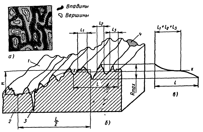 Поверхностный слой с геометрической точки зрения представляет собой довольно сложную формацию. Как известно, любая реальная поверхность имеет отклонения формы от номинальной (идеальной) поверхности, заданной чертежом. Макрогеометрия поверхности, т. е. характеристика ее формы — овальность, огранка, конусность для цилиндрических поверхностей, выпуклость или извернутость плоскости и т. п. — является важным фактором, влияющим на работоспособность деталей. Для различных поверхностей допустимые отклонения формы оговорены соответствующими стандартами. Микрогеометрия, которая имеет не меньшее значение для оценки свойств поверхностного слоя, характеризуется шероховатостью (высотой неровностей RZ или средним арифметическим отклонением профиля от средней линии Ra и рядом других параметров по ГОСТ 2789—73) и волнистостью (совокупность периодически повторяющихся выступов и впадин с шагом, превышающим базовую длину, принятую стандартом для определения параметров шероховатости). Микрорельеф поверхности представляет собой достаточно сложную картину с различной шероховатостью в направлении обработки и в перпендикулярном к ней направлении (рисунок 1). Микротопография поверхности (рисунок 1, а) показывает сложное чередование впадин и выступов, поэтому профилограмма является случайным сечением и лишь с известной степенью приближения характеризует рельеф поверхности. На работоспособность изделия влияют не только основные характеристики волнистости (рисунок 1, б) (высота волны Н и ее шаг L) и шероховатости (Rz; Ra, средний шаг S и максимальная высота неровностей Rmax), но и форма микронеровностей, их направление, форма волнистости и другие параметры микрорельефа. Для характеристики шероховатости часто применяют интегральную характеристику — кривую опорной поверхности (рисунок 1, в) и отдельные показатели, оценивающие форму микрорельефа. Так определяют шаг микронеровностей, средний радиусов впадин и выступов, параметры кривой опорной поверхности и др. Шероховатость и волнистость поверхностного слоя зависят от вида технологического процесса и режимов обработки — величины подачи, скорости резания, применения смазочно-охлаждающей жидкости, от геометрии режущего инструмента, жесткости и виброустойчивости системы СПИД (станок — приспособление — инструмент—деталь).