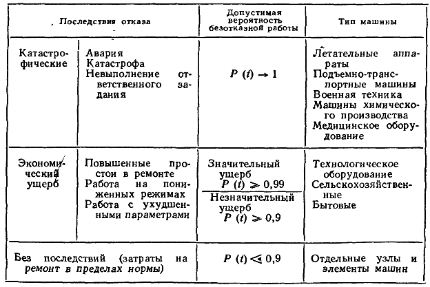 Классификация машин по надежности может быть произведена с двух точек зрения. Во-первых, по тем последствиям, к которым может привести отказ (табл.2), и во-вторых, по тем причинам, которые приводят к необходимости восстанавливать утраченную в процессе эксплуатации работоспособность. Безотказность машины определяется работой наиболее ответственных узлов и систем, так как в любой машине есть узлы, выход из строя которых не приводит к указанным недопустимым последствиям. Например, во время полета самолета отказал один из его узлов. Если это шасси, то последствия будут катастрофические, если снизится КПД двигателя — то экономический ущерб, если испортилось кресло пассажира, то практически отрицательных последствий не будет. Значение вероятности безотказной работы оценивается за тот период, который характерен для данного типа машин. При классификации машин по долговечности (табл. 3) указываются в первую очередь причины, связанные с выходными параметрами машины, приводящие к необходимости направлять машину в плановый ремонт (текущий или капитальный).
