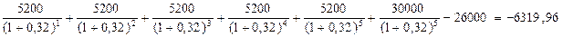 Получив положительное значение чистой текущей стоимости, необходимо увеличивать значение ставки дисконта, добиваясь нулевого значения NPV. Выберем ставку дисконтирования в 32%: NPV=