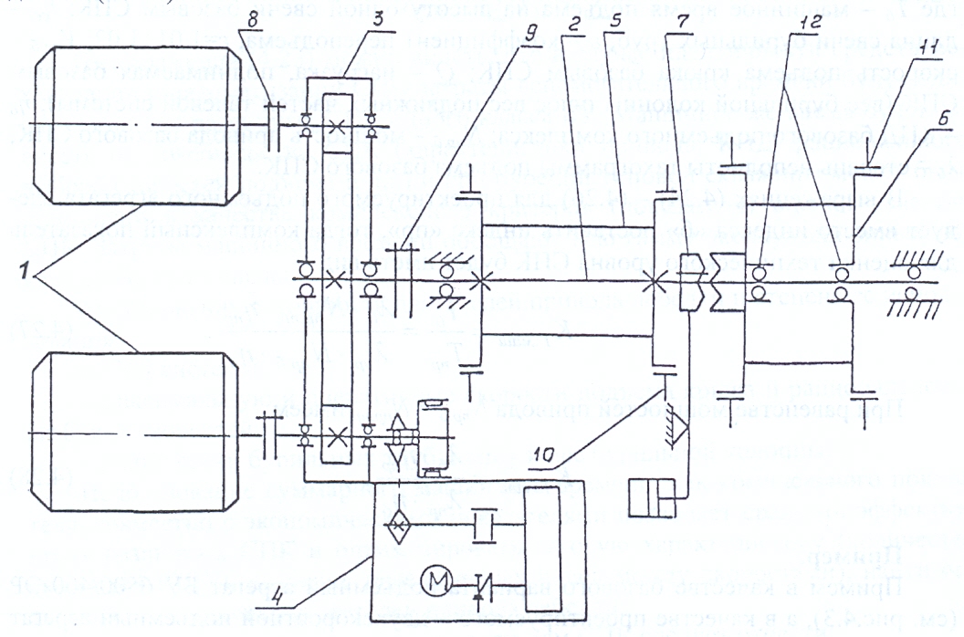 1 - электродвигатель; 2 - двухбарабанная лебедка; 3 - спаривающий редуктор; 4 - регулятор подачи долота; 5, 6 - барабан; 7 - кулачковая муфта; 8, 9 - муфта; 10, 11 - ленточный тормоз; 12 - подшипник.