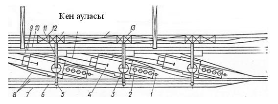 3-сурет Пештері аралша орналасқ ан домна цехның планы (4 ұ ң ғ ылы, материалдарды колошникке конвейерлі беретін жә не шлакты ожаусыз жинайтын жомна пештері). Мұ ндай жоспарды цех жинақ ты болады, бірақ балқ ыманың сұ йық ө німдерін жинау қ иындайды (барлық домна пештерінде ө німдерді шығ арып алудың нақ тылы келіскен кестесі болуғ а керек), артық қ ұ ю алаң ы шойын мен шлак ұ ң ғ ысына қ ызмет жасауды қ иындатады, цех шегіндегі шойын жә не шлак таситын жолдардың арасында байланыс қ атынасы болмайды. Пештерінің пайдалы кө лемі 1300 м3 домна цехының екінші типтік жобасын 1936ж. ГИПРОМЕЗ жасады. Бұ л жобада ә р пештің ө зінің дербес қ ұ ю ауласы болатын болды. Сондық тан пештердің бұ лай орналасуын арал тә ртібінде деп атайды. Мұ ндай жағ дайда темір жол кө лігінің жұ мыс істеуіне жақ сы жағ дай жасалынады, домна пешін пайдалану жә не жө ндеу жұ мыстарын жаса барысында зызмет кө рсету жағ дайлары жақ сарады. Жолдар екі жағ ынан бірдей қ осылғ ан, бұ л ә р домна пешінің бір-біріне тә уелсіз жұ мыс істеуін қ амтамасыз етеді. Қ ұ ю ауласының жұ мыстарын істеуге тұ йық жол қ арастырылғ ан. Домна пештерінің барлығ ы бір сызық бойына орналасады, ал ауа қ ыздырғ ыш блогі, қ ұ ю алаң ы жә не шойын мен шлак ожауларын қ оятын жолдар осы ось бойына бұ рышпен орналасады. Мұ ндай жоспарлау қ азіргі жомна цехтарына тә не келеді (№2 жә не №3 суретті қ ара). Шойын мен шлактың жү к ағ ыны жеке жү ргізілетін цехтардың жұ містеу қ абілеті ең жоғ ары болады. Ұ сынылып отырғ ан жобада домна пештерінің цехтың осінің бойында арал тә ртібімен орналасуы жә не шойын мен шлак ағ ынының жеке-жеке жү руі қ арастырылғ ан. Ә р пеш ү шін домна пешінің осіне (цехтың осіне) қ арай 45° жү к қ ойылатын жолдар орналасқ ан. Жү к қ ойылатын жолдардың барлығ ы тұ йық жол болып келеді де жомна пешінің осінің екі жағ ына орналасқ ан шойын мен шлактың транзит (ө тетін=жү ретін) жолына шығ ады. Жү к (ожау жә не т.б.) қ ойылатын жолдар мен астаулардың ұ зындығ ын жә не шойын ұ ң ғ ысының орын дең гейін қ ысқ арту ү шін, жү к қ ойылатын жолдардың санын арттырады, ал ол шойын мен шлактың ағ ынын ажыратумен қ атар жү реді. Осы жобағ а сай домна пештерінде дө ң гелек (ең алдың ғ ы ретінде) қ ұ ю ауласы қ арастырылғ ан, ал шойын 4 шойын ұ ң ғ ысы арқ ылы екі жағ ына қ ұ йылады. Қ ұ ю ауласының екі жағ ынан екі-екіден шойын таситын жә не шлак таситын екі жү к қ ойылатын жолдар болады. Шихталық материалдар жү к тиеу станциясынан ковейрлермен бункерлік эстакадаларғ а беріледі, ал одан олар цехтың осіне параллел орналастырылғ ан жолдар бойымен темір жол жә не конвейерлермен жеткізіліп беріліп тұ рады. Одан басқ а, осы жобада қ ұ ю ауласына қ ажетті материалдар мен жабдық тар жеткізіліп беріліп тұ ратын шаруашылық жолының боуы қ арастырылғ ан. Тү скен шлактың барлығ ы ө ң деу ү шін шлак ө ң деу учаскесіне тасымалданады, ол домна цехының сыртында, шлак ү йіндісінің жолының ү стінде орналасады. Агрегаттардың кә дімгідей жұ мыс істеуін қ амтамасыз ету ү шін жә не қ ұ рылыс нормаларының талаптарын орындау ү шін домна пештерінің орталық тораптарының аралығ ы, осы жобағ а сай, 350 м қ ұ райды.