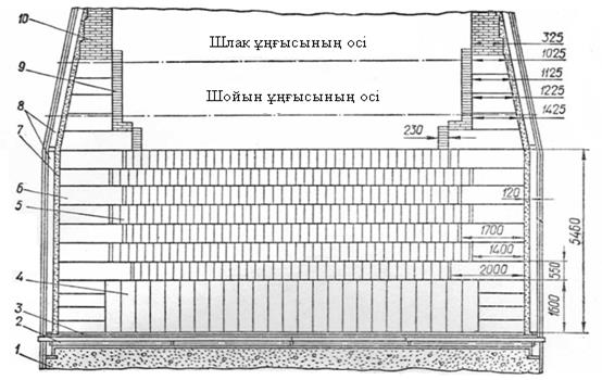 1 – ірге тасы; 2 – тү птік тоң азытқ ыштар; 3 – металл тү п; 4 – графиттелінген блоктар; 5 – жоғ ары глиноземді кірпіш; 6 – кө міртекті блоктар; 7 – кө міртекті масса; 8 – шеттік мұ здатқ ыш; 9, 10 – шамоттық кірпіш.