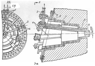 1, 2 – су беріп тұ руғ а жә не ол ағ ып кетуге арналғ ан қ ұ бырлар; 3, 4 - тірегіштер; 5 – тойтармалар; 6 – фланец; 7 – амбразура; 8, 9 – тоң азытқ ыштар; 10 – фурма.