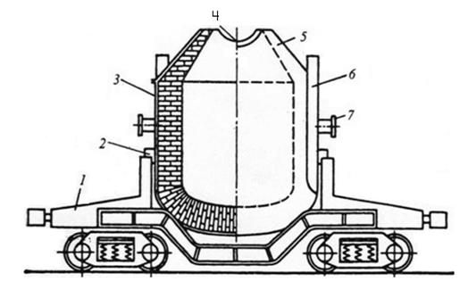 Шойын тасығ ыш (20-сурет) алмұ рт формалы ожауымен-3 платформаның -1 ү стіне орнатылғ ан ожау-3 болып келеді. Ожауды цапфаларымен-7 арбашының ү стіне орнатады; ожау арбашаның ү стіне тө рт цапфалары-2 арқ ылы отырады. Ожау шамот кірпішімен иніштелінген, сиымдылық тары олардың 100 – 140 тоннағ а жетеді. Оның мойынындағ ы-5 тесік-4 домна пешіне шығ арылғ ан шойынды қ абылдауғ а жә не шойынды ожаумен қ ұ йып алуғ а арналғ ан. Жақ тарды қ ұ йғ ыш машинасында ожауды ең кейткенде тіреуіш ү шін қ олданады. Мұ ндай ожаулар шойынды болат балқ ыту цехының миксерлік бө лімшесін жә не домна цехының қ ұ йғ ыш машинасына тасмалдауғ а арналғ ан. Ожаулар миксер тү рінде де болады. Домна цехында қ ортылғ ан шойынды ү зіліссіз тасмалдап тұ ру ү шін шойын тасығ ыш ожаулардың қ ажетті мө лшерде саны болуы керек. Бү кіл шлак шойынмен бірге ағ ып шығ атынын есепке ала отырып, шлак тасығ ыш ожаулар да болуғ а тиісті. Шлак тасығ ыш дегеніміз-тірек сақ инасына алмалы-салмалы шлак ожау-6 бекітілген, ө здігінен жү ретін темір жол арбашасы (21-сурет).