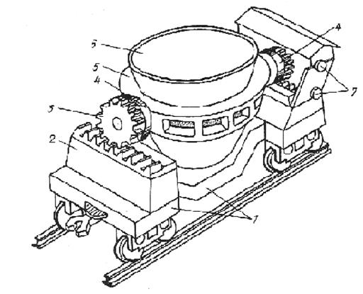 1 – арбаша; 2 – лафеттер; 3 – тісті секторлар; 4 – цапфалар; 5 – тірек сақ ина; 6 – алмалы-салмалы шлак ожауы; 7 – тірек сақ инаны бұ ратын механизм.