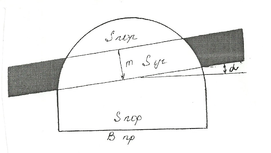 Тому, що штрек проводиться по вугільному пласту бічних порід, необхідно вибрати вид підривання і визначити величину коефіцієнта присічки.Коефіцієнт присічки визначається за формулою: Кnp = де Sпр – площа поперечного перетину у виробці в проходці, м2; Sпор – площа порідного вибою, м2 Площу порідного вибою визначимо за формулою: Sпор = Sпр – Sвуг, = 17, 5 – 7, 64 = 9, 86 м2 (2.5) Площу вугільного вибою визначимо за формулою: Sвуг. де Впр = 5450 мм – ширина в проходці; m = 1, 4 м – потужність вугільного пласта; α – кут похилу пласта, градуси. Виходить коефіцієнт підривання – 56%. При проведенні штреків по тонких пластах вибір місця підривання залежить від умов навантаження вугілля з очисного вибою на штрек, у вагонетки, що знаходяться в ньому, чи на конвеєрі, кута падіння і характеру бічних порід. При цьому бажано, щоб пласт займав у перерізі виробки найбільшу площу. Тому що транспортування вугілля по штреку здійснюється конвеєром, положення підошви пласту визначаємо за формулою: h1 = hк + 0, 4 = 0, 2 + 0, 4 = 0, 6 м (2.7) де hк = 0, 2 м – висота рештачного ставу конвеєра; 0, 4 – перевищення конвеєра лави над конвеєром штреку для зручності навантаження, м.
