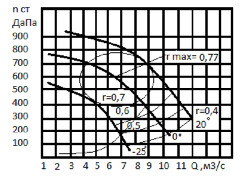 По отриманим даним будуємо характеристику мережі трубопроводу (рисунок 2.4). З аеродинамічної характеристики вентилятора береться та, яка знаходиться вище крапки з координатами Qв і hв. Крапка перетинання аеродинамічних характеристик вентилятора і вентиляційного трубопроводу називається робочою крапкою. Вона визначає робочий режим вентилятора. Робоча крапка вентилятора ВМЦ-8 на даний вентиляційний трубопровід буде мати такі параметри: Qр.т = 7, 0 м3/с; Нр.т. = 190 даПа