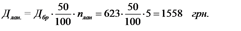 де О баз. – базовий оклад бригадира гров, грн.; Д – розмір доплат за керівництво бригадою, %. Доплата за керівництво ланкою становить 50 % від доплати за керівництво бригадою, при цьому чисельність ланки не повинна бути менше ніж 5 осіб. Сума доплат за керівництво ланками (Длан., грн.) складе