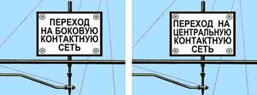 | В местах, не допускающих проследования электроподвижного состава с поднятыми токоприемниками (при неисправности контактной сети, производстве плановых ремонтных и строительных работ, когда при следовании поездов необходимо опускать токоприемники), устанавливаются временные сигнальные знаки с отражателями, которые показывают: