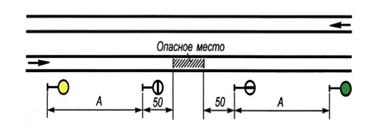 | А-расстояние от сигнальных знаков «Начало опасного места» и «Конец опасного места» до сигналов уменьшения скорости. Б- Расстояние от переносных красных сигналов и от места внезапно возникшего препятствия до первой петарды. Расстояния А и Б зависят от руководящего спуска и максимальной допускаемой скорости движения поездов. На Кяр ж.д. А=1000 метров, Б=1200 метров.