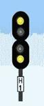 два желтых огня, верхний мигающий - разрешается поезду отправиться с железнодорожной станции с уменьшенной скоростью; поезд следует с отклонением по стрелочному переводу; перегон до следующей железнодорожной станции (путевого поста) свободен, входной светофор следующей станции открыт;