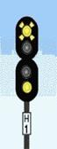 два желтых огня - разрешается поезду отправиться с железнодорожной станции с уменьшенной скоростью; поезд следует с отклонением по стрелочному переводу; перегон до следующей железнодорожной станции (путевого поста) свободен;