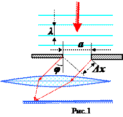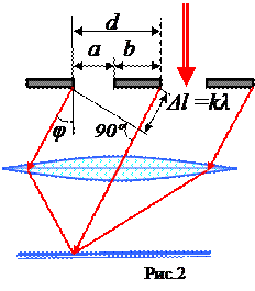 На каждой щели происходит дифракция света, так что согласно сказанному выше по различным направлениям свет распространяется неравномерно. По направлениям, соответствующим а sinφ =kλ, где k = + 1, + 2, + 3,.. имеются так называемые главные минимумы, которые, повторимся, зависят от ширины а прозрачных щелей. Кроме того, интерференция лучей, идущих с различных щелей дают дополнительные минимумы и максимумы. Вторичные волны, идущие с соседних щелей имеют оптическую разность хода Δ х между собой (рис.2). При равенстве разности хода целому числу длин волн эти волны суммируются, а при равенстве разности хода целому+половина числу длин волн - взаимно вычитаются (гасят друг друга).