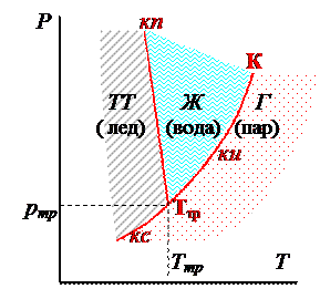 Все три кривые сходятся в тройной точке Т тр, в которой могут существовать все три фазы: твердая, жидкая и газообразная. Значение температуры тройной точки: Ттр =0, 01º С. Выше критической точки К происходит слияние жидкой и газообразной фазы. Согласно уравнения Клапейрона-Клаузиуса, производная от равновесного давления по температуре равна