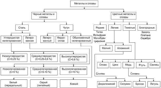 Определение металлов и сплавов Металлами называются вещества, атомы которых располагаются в определённом геометрическом порядке, образуя при этом кристаллы. Им присущ специфический металлический блеск. Кроме того, металлы обладают хорошей пластичностью, высокой теплопроводностью и электропроводностью. Это дает возможность обрабатывать их под давлением (прокатка, ковка, штамповка, волочение). Металлы обладают хорошими литейными свойствами, а также свариваемостью, способны работать при низких и высоких температурах. Металлические изделия и конструкции легко соединяются с помощью болтов, заклепок и сварки. Наряду с этим металлы обладают и существенными недостатками: имеют большую плотность, при действии различных газов и влаги коррозируют, а при высоких температурах значительно деформируются. Существует такое определение как «чистый металл» оно весьма условно. Так как любой чистый металл содержит примеси, а потому его следует рассматривать как сплав. Под термином «чистый металл» всегда понимается металл, содержащий примеси 0, 01–0, 001 %. Современная металлургия позволяет получать металлы высокой чистоты (99, 999 %). Однако примеси даже в малых количествах могут оказывать существенное влияние на свойства металла. Чистые металлы обладают высокой пластичностью и низкой прочностью, что не обеспечивает требуемых физико-химических и технологических свойств. Поэтому их применение в строительстве и технике в качестве конструкционных материалов сильно ограничено. Наиболее широко используют сплавы, обладающие более высокой прочностью, твердостью и износостойкостью и т. д. Сплавы – это системы, состоящие из нескольких металлов или металлов и неметаллов. Так, например, прочность технического железа составляет примерно 250 МПа, при введении в железо углерода в количестве 0, 9 мас.% прочность повышается до 980 МПа. Все металлы и образованные из них сплавы делят на две группы: черные и цветные К черным металлам относятся железо и сплавы на его основе – стали и чугуны, остальные металлы являются цветными. В строительстве в основном применяют черные металлы – чугуны и стали для каркасов зданий, мостов, труб, кровли, арматуры в бетоне и для других металлических конструкций и изделий. К цветным металлам относятся все металлы и сплавы на основе алюминия, меди, цинка, титана. Цветные металлы являются более дорогостоящими и дефицитными. Чугун получают в ходе доменного процесса, основанного на восстановлении железа из его природных оксидов коксом при высокой температуре. Процесс восстановления железа оксидом углерода в верхней части доменной печи можно представить по обобщенной схеме: Fe2O3 > Fe3O4 > > FeO > Fe. Опускаясь в нижнюю часть печи, расплавленное железо соприкасается с коксом и превращается в чугун. Чугуны в зависимости от состава и структуры подразделяются на серые (углерод в виде цементита и свободного графита) и белые (углерод в виде цементита). В зависимости от формы графита и условий его образования различают: серый, высокопрочный и ковкий чугуны. Стали можно подразделить на две основные группы – углеродистые и легированные (рис. 1). Углеродистые стали – основной конструкционный материал, который используется в различных областях промышленности. Они дешевле легированных и проще в производстве. В углеродистой стали свойства зависят о