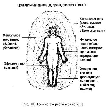 Духовная эволюция несет нам новые знания о физическом теле человека и правилах ухода за ним. Медицинская парадигма, господствовавшая на Западе в течение последних трех столетий (с тех пор как французский философ Рене Декарт определил тело как машину), ныне радикально изменяется в сторону холистических представлений о теле-сознании. Прежде мы воспринимали здоровье как отсутствие заболеваний. Теперь мы оцениваем здоровье исходя из того, насколько свободно течет через наше тело жизненная сила (прана, ци и т. д.). В оптимальном случае жизненная сила должна течь совершенно беспрепятственно. Мы не можем быть здоровы, если тело засорено энергиями обиды, гнева, печали, вины и горя. Говоря о теле, мы имеем в виду не только физическое тело, являющееся одновременно энергетическим телом, но и об окружающих его тонких телах. Мы выделяем следующие тонкие тела: эфирное тело, эмоциональное тело, ментальное тело и каузальное тело. Каждое из них имеет свою особую частоту колебаний. Если раньше мы определяли тело как сочетание химических элементов и молекул, то теперь физики предлагают нам воспринимать тела как плотные конденсации взаимодействующих энергетических структур. Тонкие поля обволакивают физическое тело слоями, словно вибрирующие энергетические чехлы, и колебания каждого из них на октаву выше, чем у предыдущего. Однако они не являются фиксированными структурами с четкими границами, как это показано на рисунке. Эти тела в значительной степени проникают друг в друга, являясь составляющими единого океана энергии, который окутывает тело. Тонкие тела определяются не столько положением в пространстве, сколько частотами своих колебаний. Тонкие тела гармонично резонируют с вибрирующими структурами физического тела, давая возможность сознанию (разуму) взаимодействовать с телом. Именно это мы имеем в виду, говоря о телесно-умственном континууме, где разум существует как в пределах физического тела, так и вне его. (Более подробно о свойствах и функциях, приписываемых каждому из тонких тел, см. часть III, глава 15.)