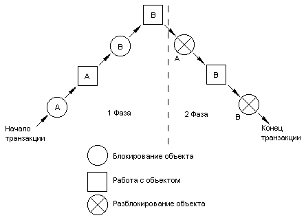 Рисунок 2 Транзакция, не подчиняющаяся протоколу двухфазной блокировки На практике, как правило, вторая фаза сводится к одной операции завершения транзакции (или отката транзакции) с одновременным снятием всех блокировок. Следствие. Если некоторая транзакция A не подчиняется протоколу двухфазной блокировки (и, следовательно, состоит не менее чем из двух операция блокирования и разблокирования), то всегда можно построить другую транзакцию B, которая при чередующемся выполнении вместе с A приводит к графику, не подлежащему упорядочению и, соответственно, неверному.