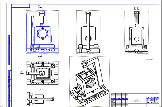 При реализации первого этапа все построения ведутся автоматически на основе созданной ранее твёрдотельной модели детали или сборки. Готовое изображение представляет собой вид или совокупность стандартных видов в форме проекционных эскизов пространственной 3D-модели. При этом положение главного вида необходимо предварительно задать на пространственной модели На созданных проекционных видах сохраняется ассоциативный режим с твёрдотельной моделью. Это означает, то что при каждом изменении формы модели, автоматически будут перестраиваться и проекционные виды. Они подразделяются на: а) стандартные; б) произвольные; в) проекционные; г) вид по стрелке или дополнительный вид. Кроме видов изображения включают два вида разрезов: а) полный; б) местный.