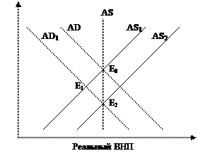 Пусть равновесное состояние экономики находится в точке Е0. Кривая совокупного спроса AD пересекает кривую совокупного предложения в точке соответствующей потенциальному уровню ВНП. В этой точке совокупный спрос полностью поглощает совокупное предложение. Предположим, что в экономике возникают форс-мажорные обстоятельства, в результате которых совокупный спрос упал. Кривая AD сместилась влево, заняв положение AD1. В краткосрочном периоде это вызовет в экономике дисбаланс между совокупным спросом и совокупным предложением. Дисбаланс будет проявляться в том, что часть совокупного предложения не найдет покупателя. Фирмы – носители предложения вынуждены будут сократить численность занятых, т.е. возникнет вынужденная безработица, незанятые производственные мощности сверх резервов. В результате этого кривая совокупного предложения понизится. Графически это проявится в отклонении кривой AS в положение AS1. Возникнет макроэкономическое равновесие в точке Е1, где пересекаются кривые AD1 и AS1. Однако это равновесие при неполной занятости экономических ресурсов. Учитывая, что классическая модель исходит из гибкости цен, то в долгосрочном периоде цены на все ресурсы и готовую продукцию, будут приспосабливаться таким образом, чтобы все ресурсы были бы использованы, а все готовые товары проданы. Совокупный спрос повысится по кривой AD1 до точки Е2, которая расположена на кривой AS. Это означает, что совокупное предложение AS2 переместилось к AS и совпадает. В экономике возникло новое макроэкономическое равновесие при полном использовании всех ресурсов. Результатом форс-мажорных обстоятельств в долгосрочном периоде явилось лишь всеобщее понижение цен, в экономике возник эффект дефляции. Верно и обратное, что если в результате каких-либо обстоятельств совокупный спрос увеличивается, то в долгосрочном периоде экономика достигает своего потенциального уровня при более высоком уровне цен, чем базовый. Экономика в таком случае переживает инфляционный эффект.