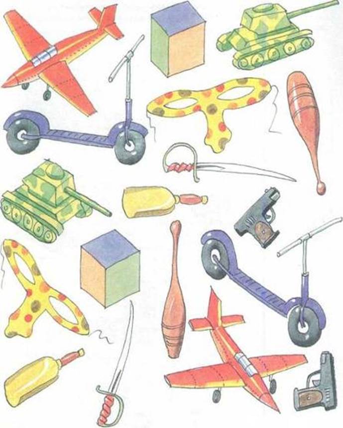 Назови игрушки, которые ты видишь на картинке. Скажи, что забыл нарисовать художник? (Ответь, чего не хватает у Буратино, самолета, коляски и часов.)