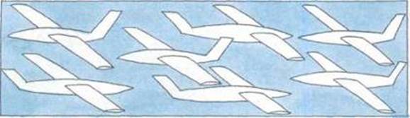 Раскрась самолеты: те, которые повернуты вправо, - синим цветом, а те, которые повернуты влево, — красным.