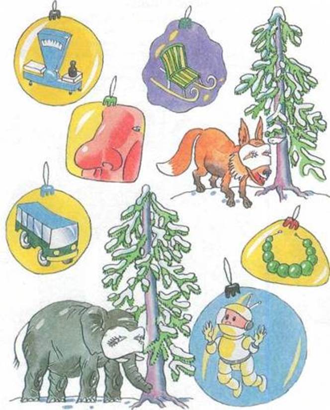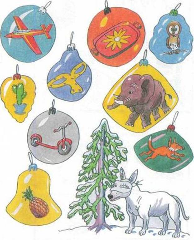 Назови тех, кто спрятался под масками (слон, лиса и пес). Кто стоит слева от елки? Кто стоит справа от елки? Назови их одним словом. Какой звук встречается в названии этих животных? Определи место звука «С» в слове (начало слова, середина, конец слова). Рассмотри елочные игрушки, назови игрушки со звуком «С» в начале слова, в середине, в конце слова. Подумай, какими игрушками украсят свои елки слон, лиса, пес с учетом места звука «С» в этих словах? Соедини игрушки с нужной елкой.