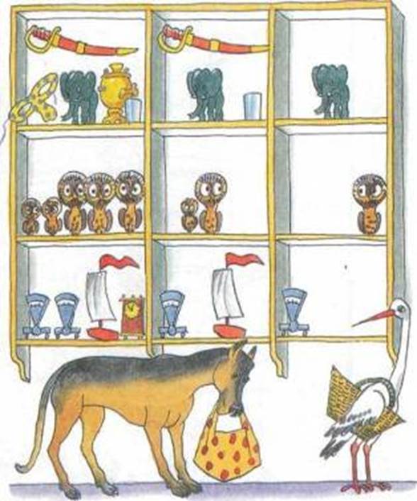 Ежедневно страус выставляет в своем магазине одни и те же товары. Назови то, что продает страус. Можно ли назвать предметы одним словом? Назови игрушки, которые находятся на верхних полках. Что стоит справа от слона и слева от стакана? Что стоит справа от маски и слева от самовара? Где висит сабля? Назови игрушки на средних полках. Где стоят маленькие совы? Где стоят большие совы? Сколько сов на крайней справа полке? Сколько сов на крайней слева полке? Сколько всего сов? Назови игрушки, которые находятся на нижних полках. Что стоит справа от парусника? Что стоит слева от парусника? В среду в магазин страуса зашла собака, чтобы купить детям подарки. Как ты думаешь, что могла купить собака? В субботу в магазин зашел аист и купил сувениры для аистят. Что, по-твоему, купил аист?