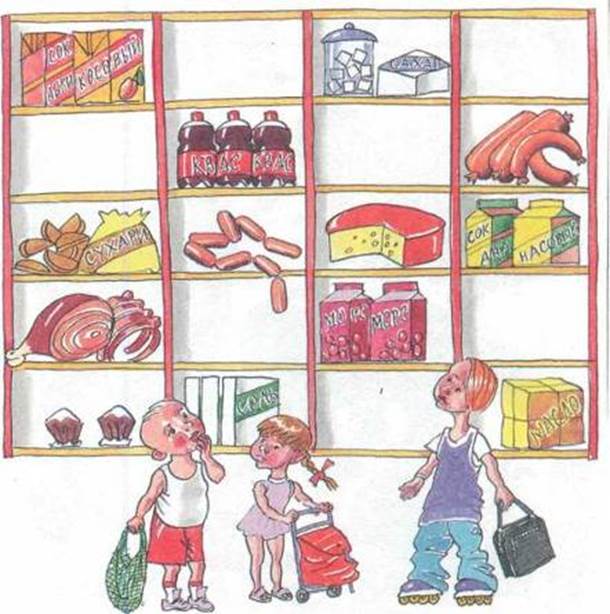 Слава, Стае и Соня пошли в магазин. Покажи каждого из них, если Стае самый высокий. Помоги детям сделать покупки: соедини дорожками продукты с сумками детей. Запомни, что Стае должен купить напитки, Слава - мясо-молочные продукты, а Соня - хлебобулочные изделия.